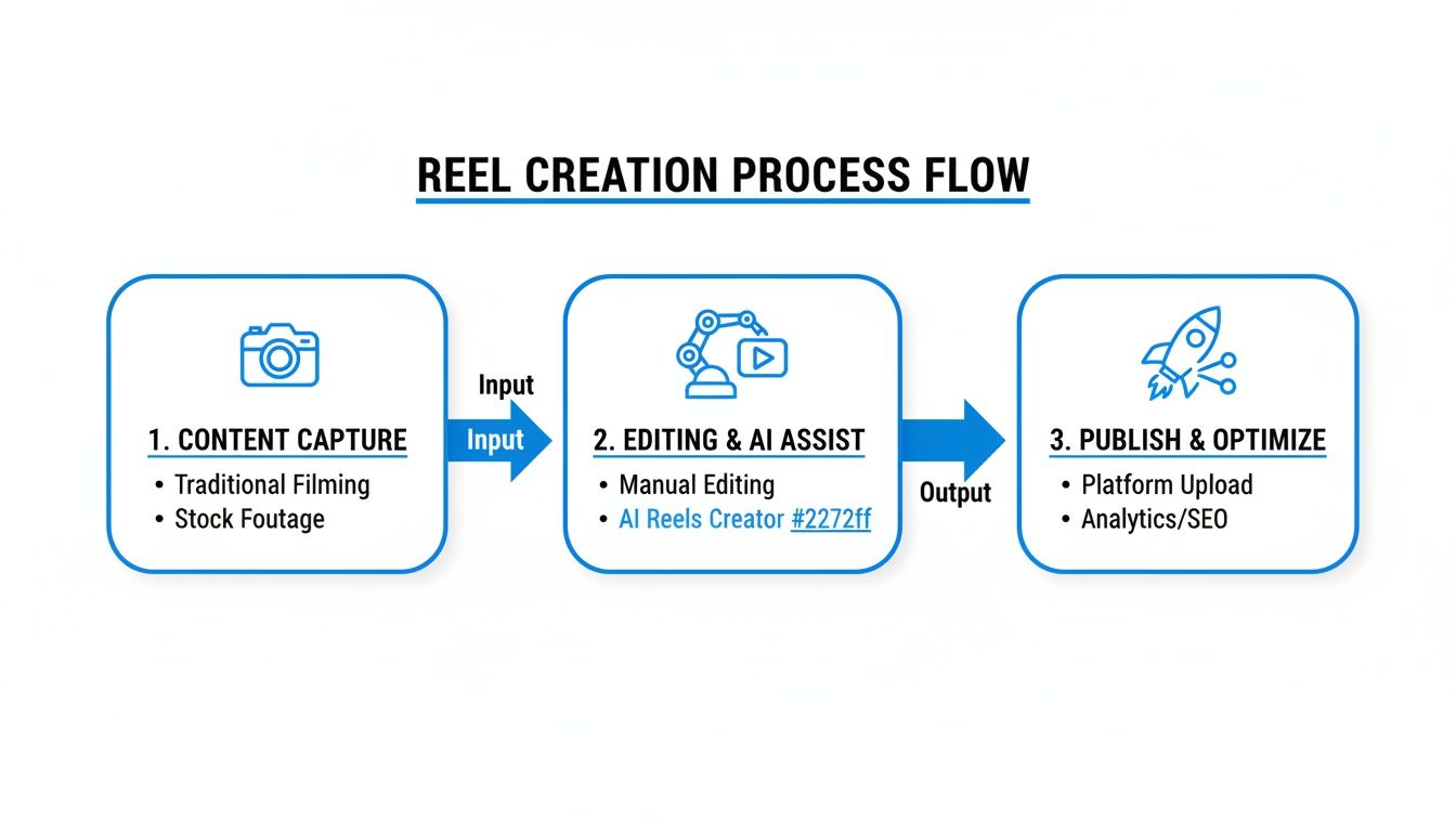 Flowchart detailing the reel creation process, including content capture, AI-assisted editing, and publishing optimization.
