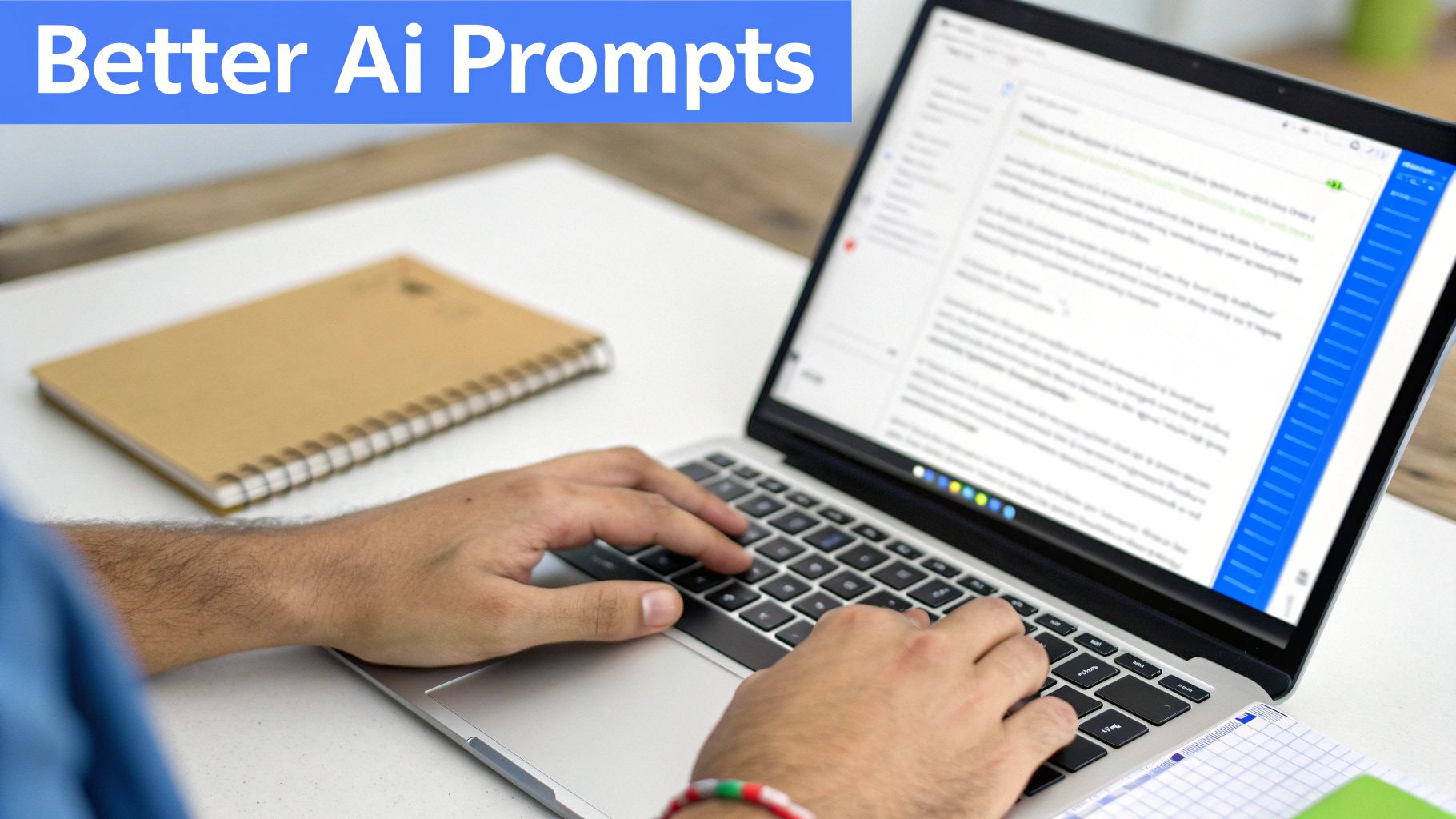 A person typing on a laptop with a 'Better Ai Prompts' banner and a notebook on a desk.
