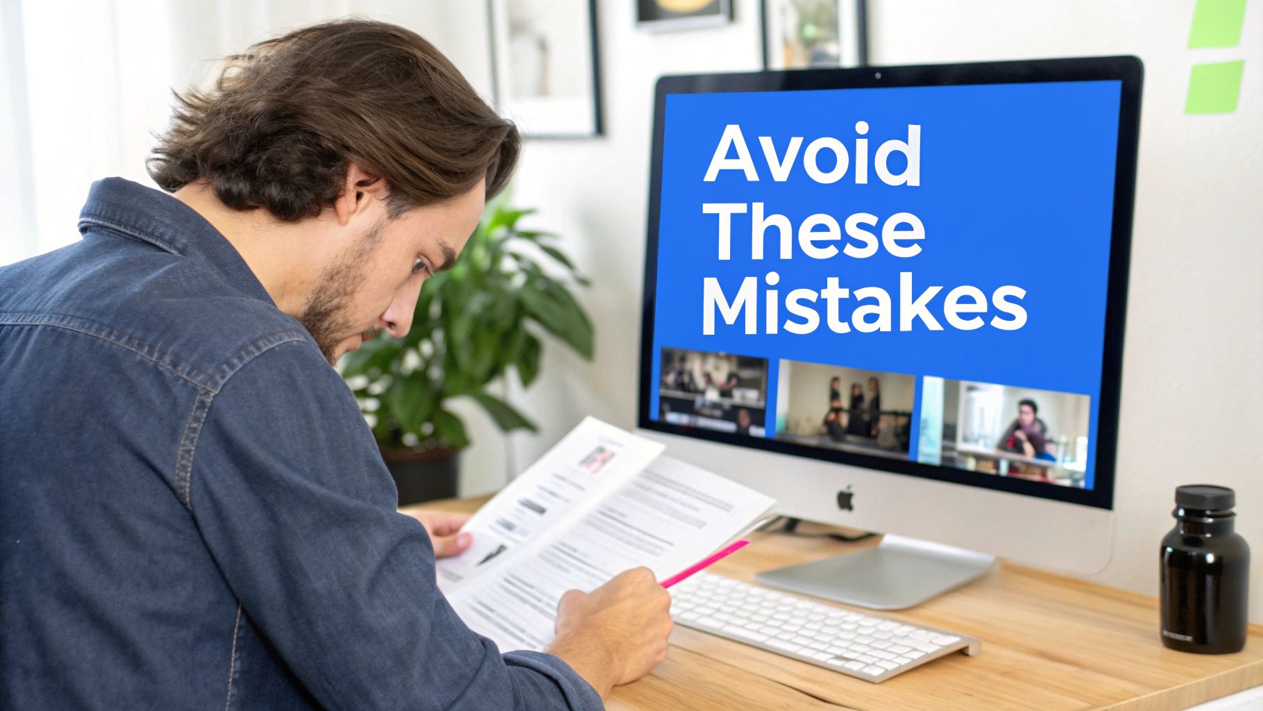 A man in a denim shirt studies a document at a wooden desk with a computer displaying "Avoid These Mistakes".