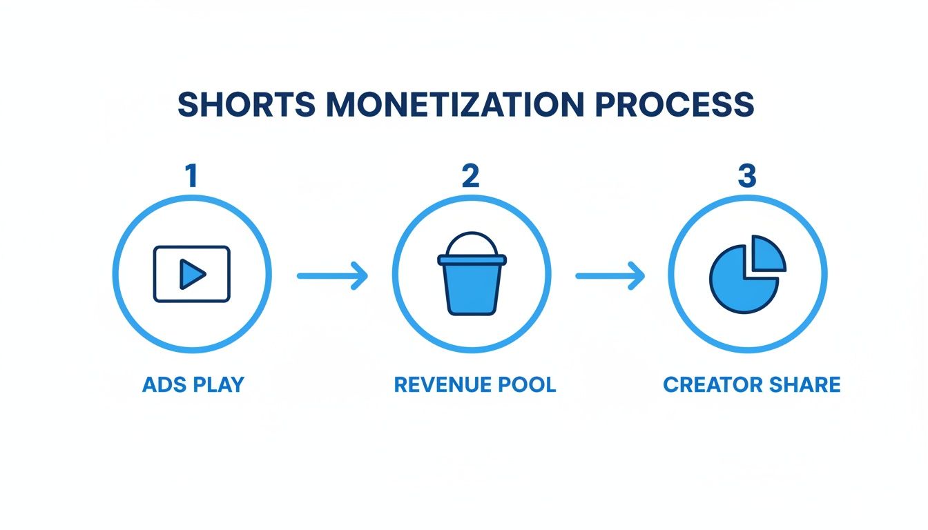 Diagram illustrating the YouTube Shorts monetization process from ads playing to the creator's share.