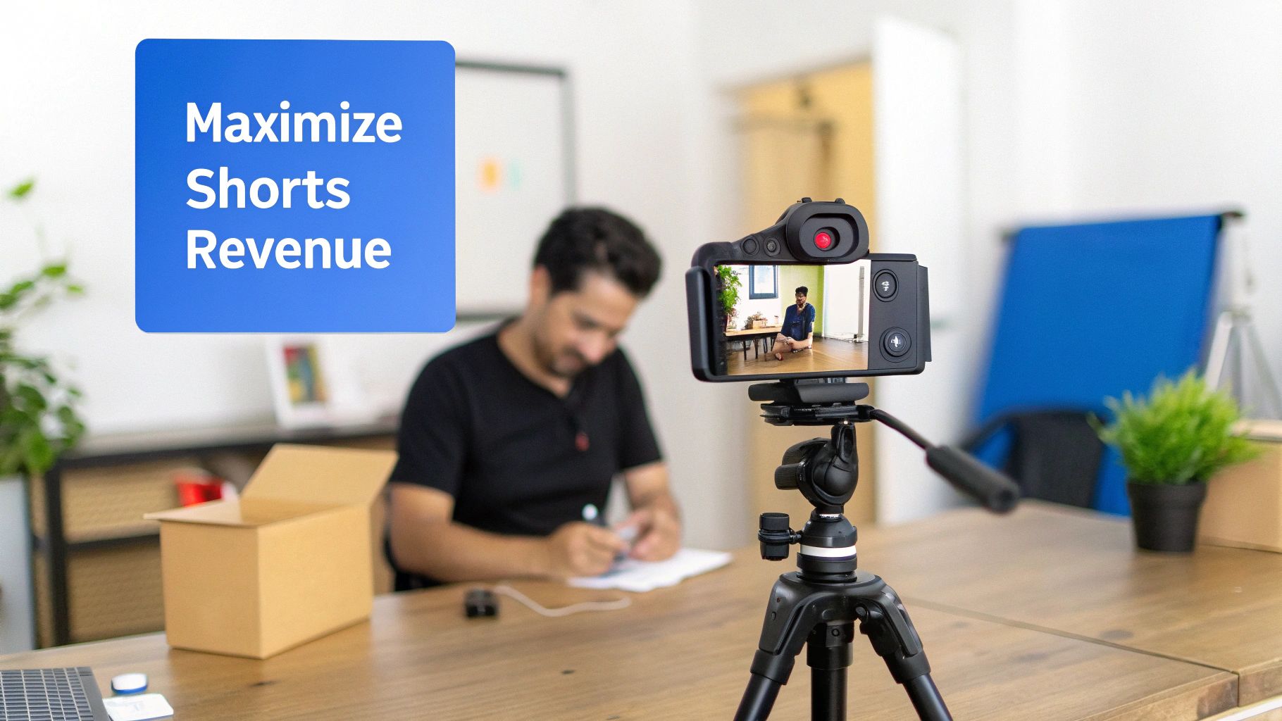 A camera on a tripod records a man, promoting 'Maximize Shorts Revenue' for content creators.
