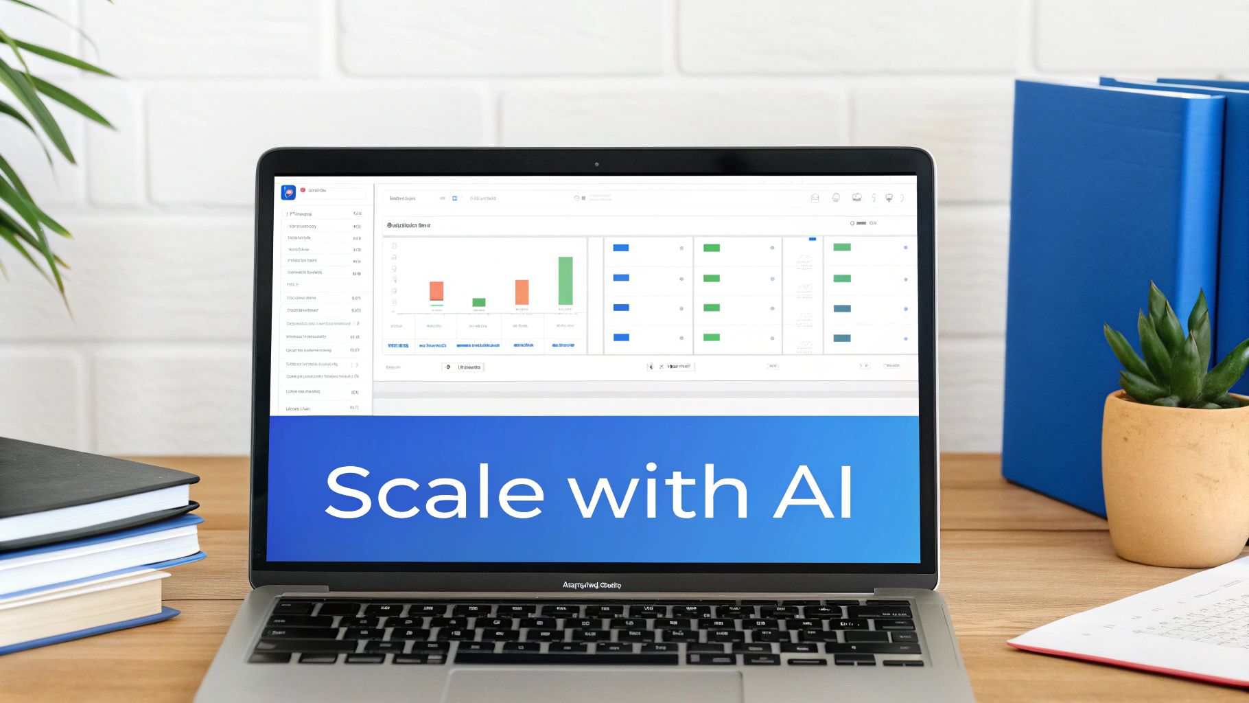 Laptop on a desk displaying an AI-powered data dashboard with 'Scale with AI' message.