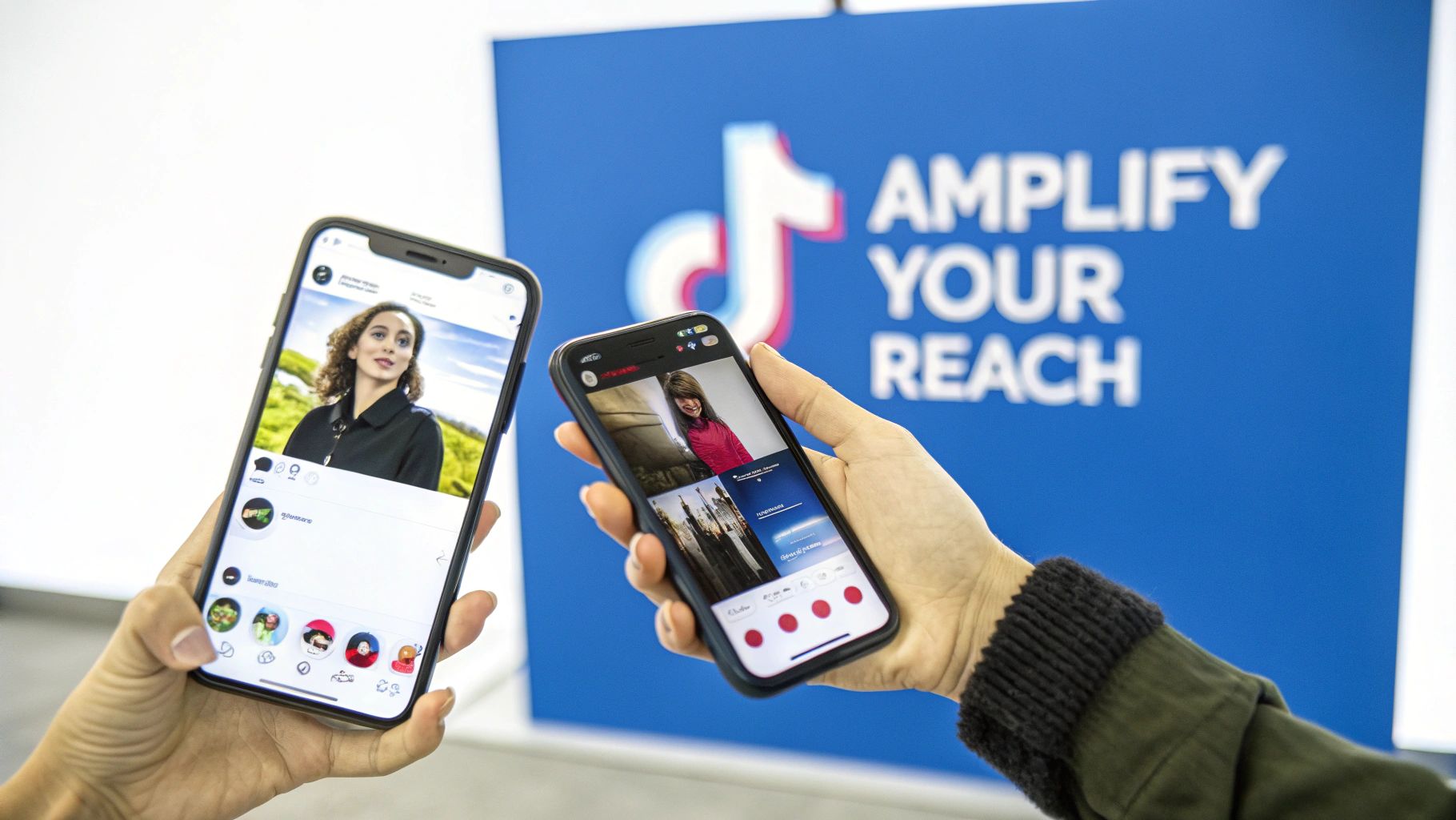 Two hands hold smartphones displaying social media content, with a 'TikTok: Amplify Your Reach' banner in the background.