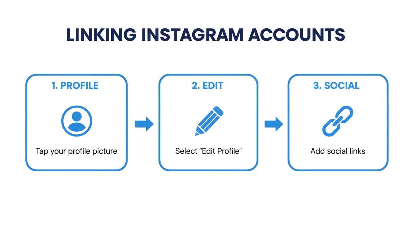 A three-step visual guide demonstrating how to link Instagram accounts through profile and social settings.