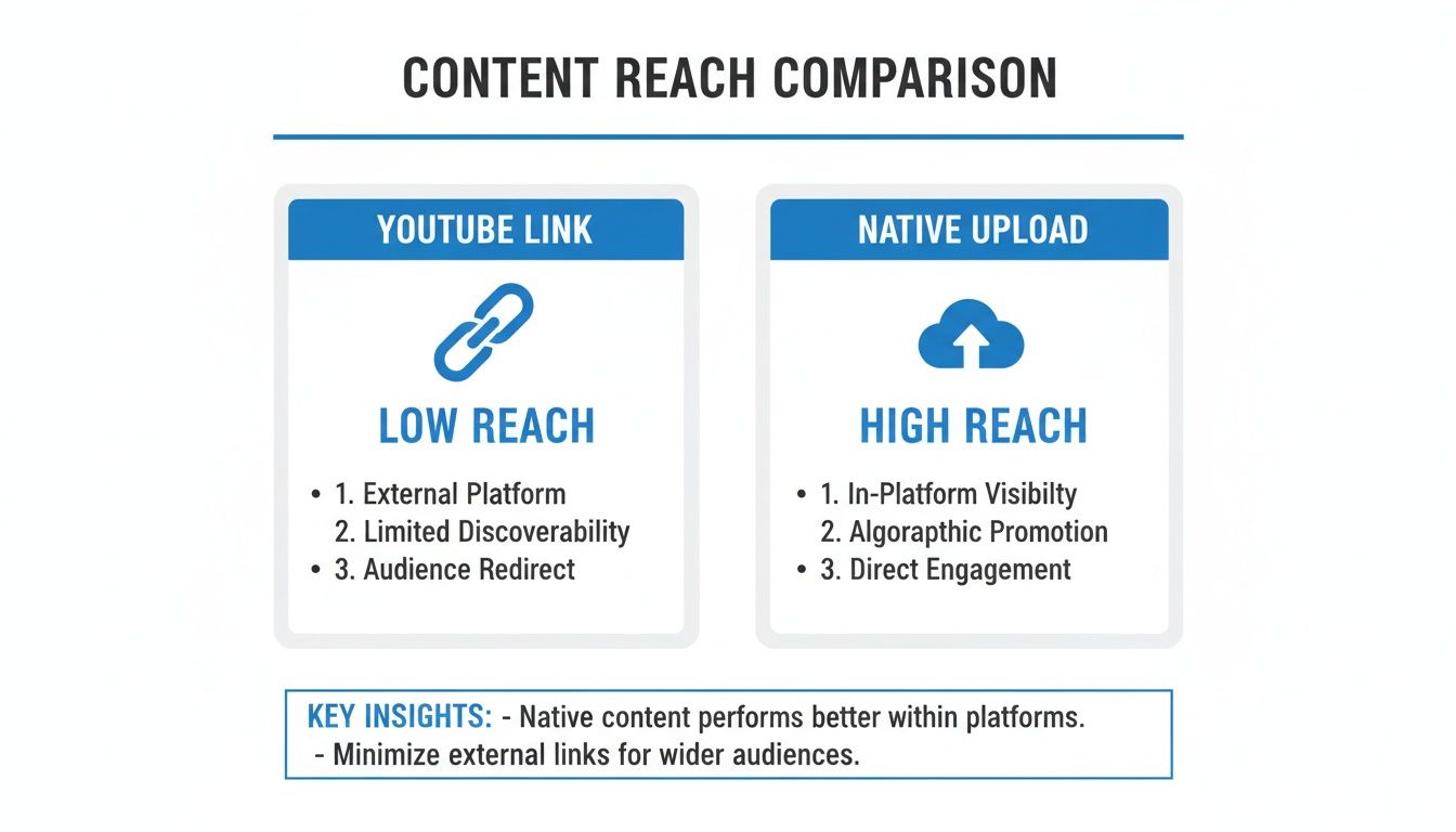 Because of this, Facebook will naturally throttle the reach of that post. A natively uploaded video is a first-class citizen in the Facebook ecosystem; a YouTube link is just a visitor passing through. The difference in organic reach isn't just noticeable, it's immediate.