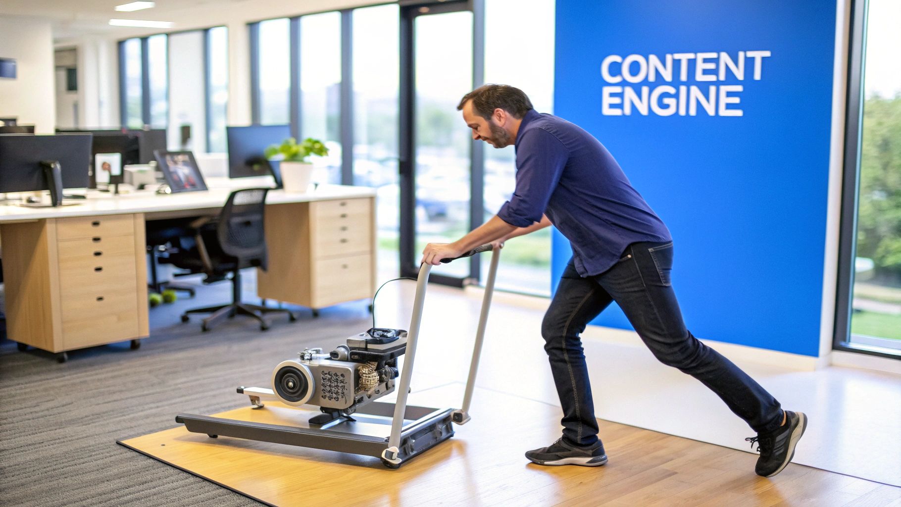 A man pushes a physical 'CONTENT ENGINE' machine on a platform within a modern office.