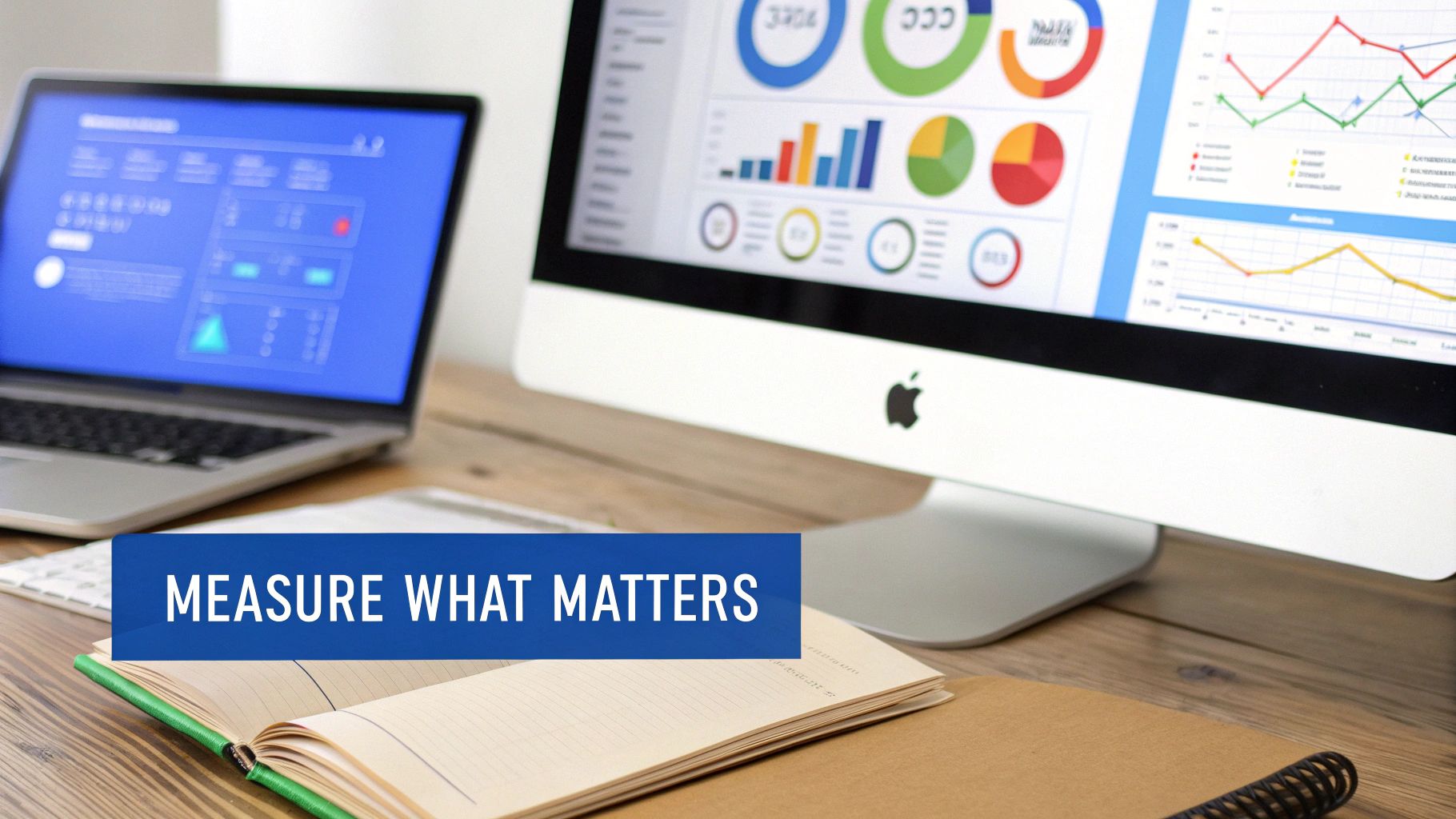 An office desk showing a laptop and monitor displaying data dashboards for performance measurement and analytics.
